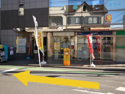 デイリーヤマザキと、りそな銀行・みずほ銀行の間の道を直進して、大通りの交差点(所沢青梅線「西所沢駅北口入口」交差点)まで進みます。